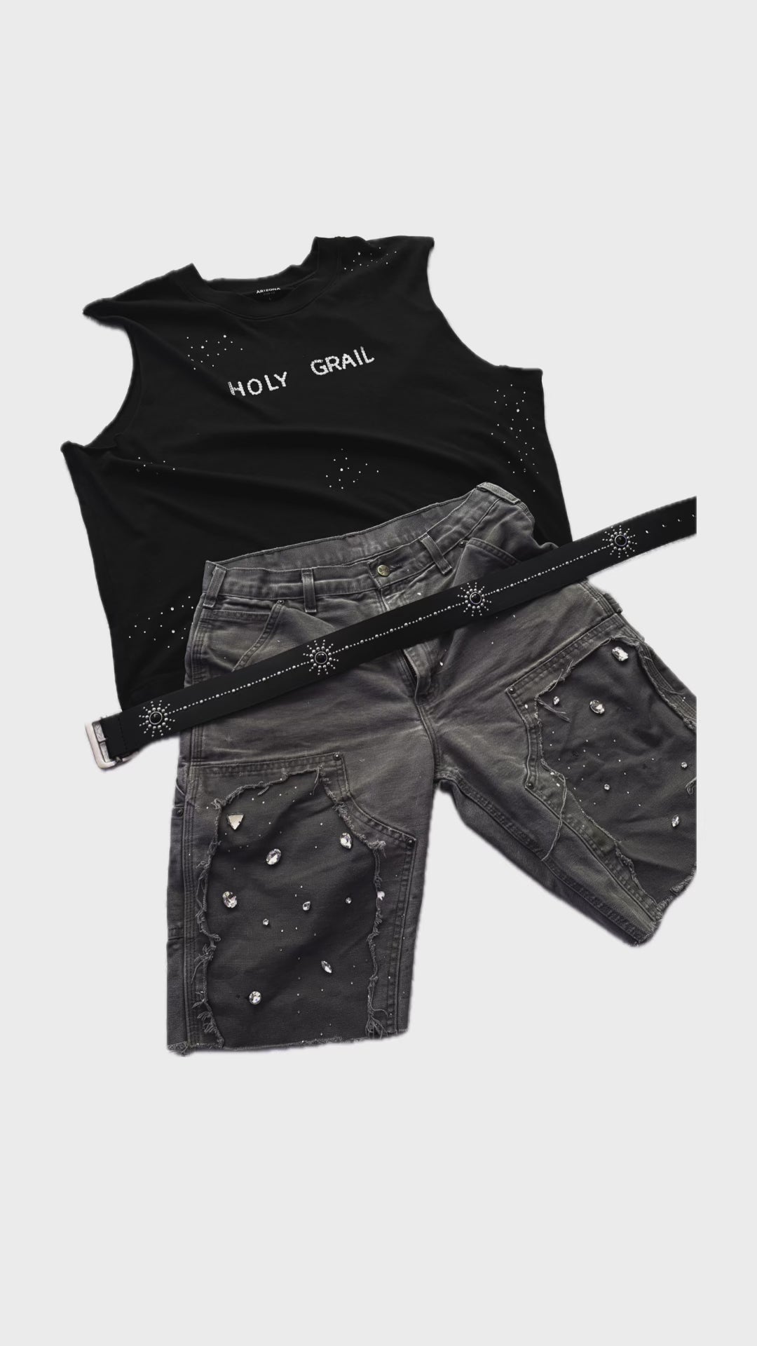 The Holy Grail Cut-Off Tee is raw and sleeveless, with a rhinestone spread that catches light from every angle. Across the chest, shimmering Holy Grail lettering makes the message loud and clear