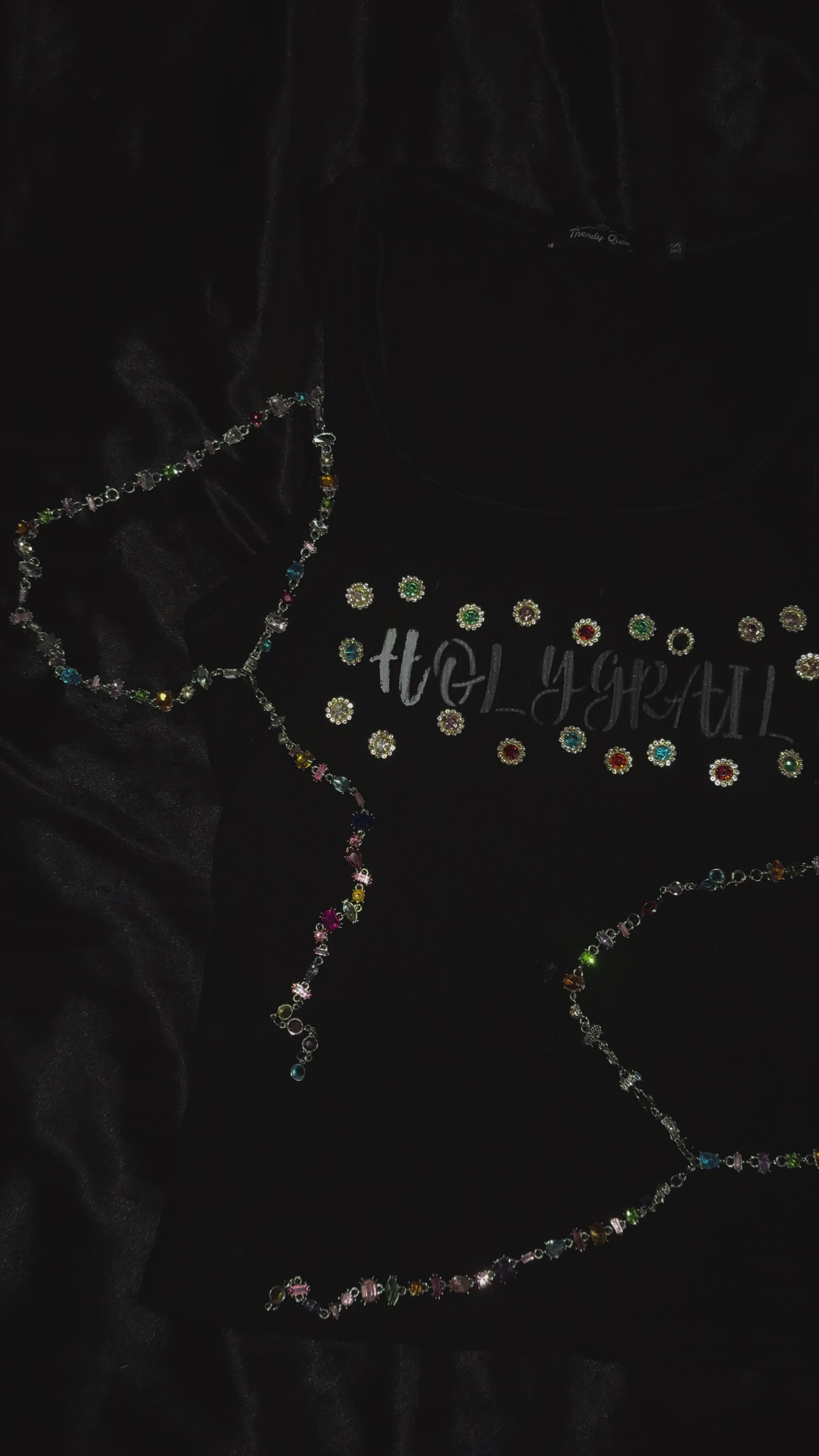 The Holy Tank features spray-painted Holy Grail lettering across the front — raw, expressive, and full of edge. Each letter is kissed with hand-placed gemstones, adding a shimmer of sacred energy to the chaos. Soft, fitted, and made to move with you,